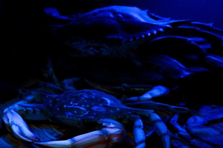 For this past week’s photo, I couldn’t quite figure out what I wanted to photograph. And then I spent the day at my Dad’s house where he has an interesting nautical scene created on a shelf. These two crabs are part of that display and are lit with blue light from above, which allowed me to focus on the small crab in the foreground and give the impression of the bigger “monster” crab lurking behind using the shadows.