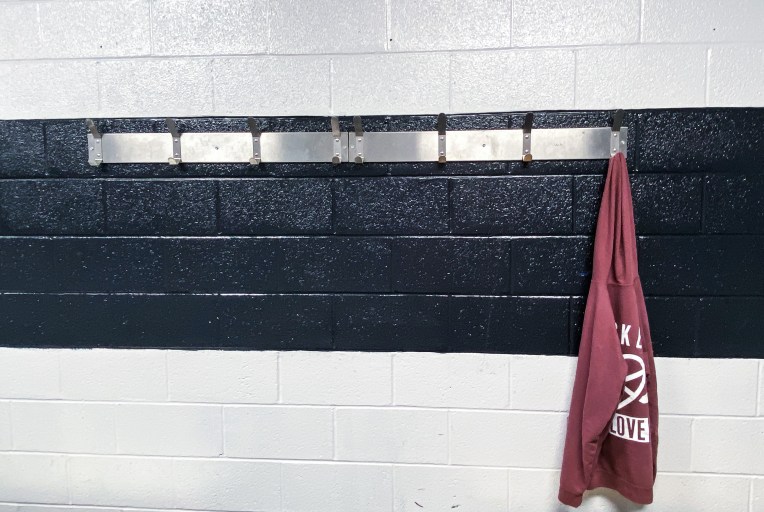 I got there before anyone else did, so I thought it was a perfect opportunity to take a photo of my hoodie hanging along on the hooks. I really love the contrast of my pink hoodie against the black and white stripes of the wall. I also really like the framing I have going here, which makes this photo interesting for me.